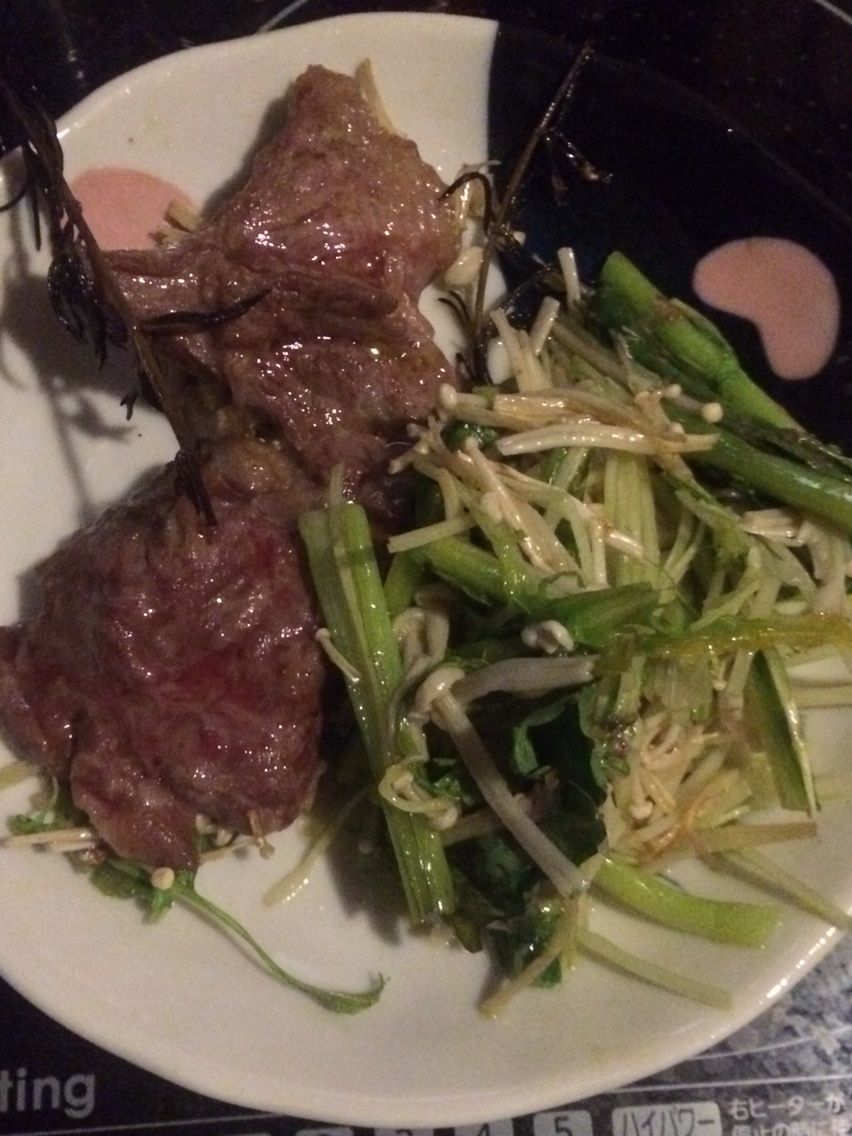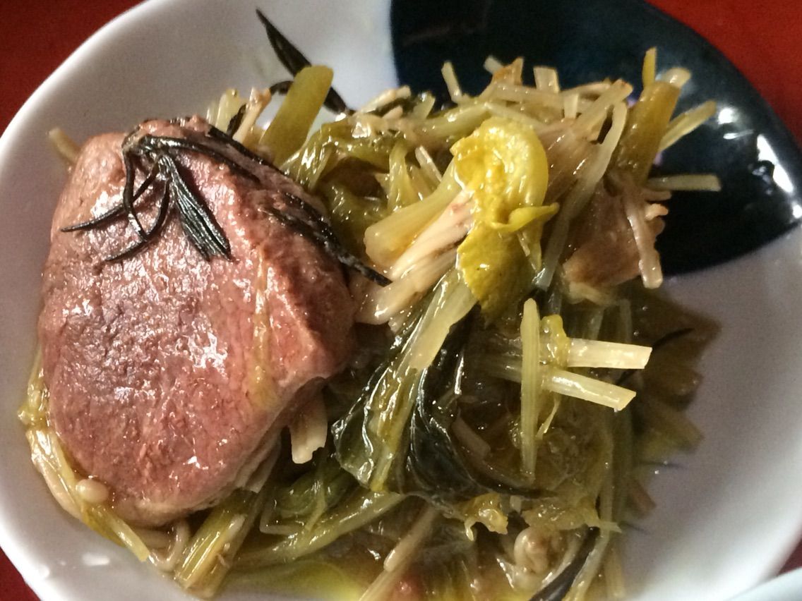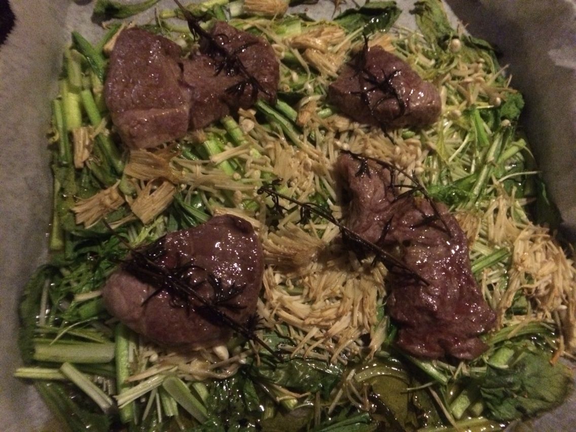 水菜・小松菜・エノキダケ・ラム肉(ステーキ用)の、村井理子さん風オーブン焼き。